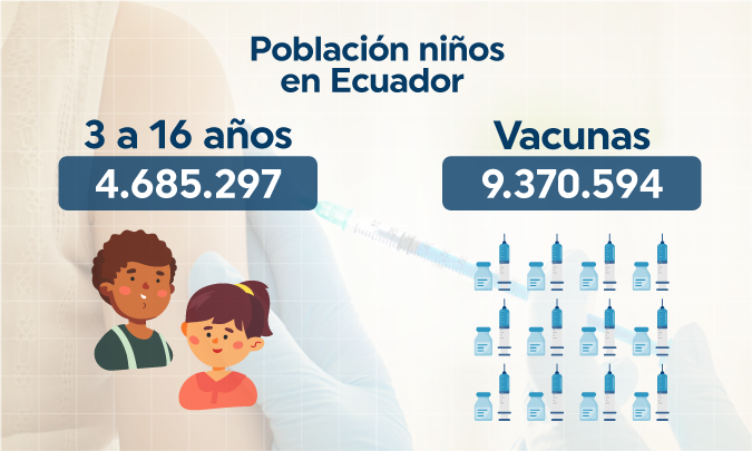 En Ecuador, según el INEC, hay 4.685.297 niños de entre 3 y 16 años, para inocularlos a todos se necesitaría 9.370.594 dosis.