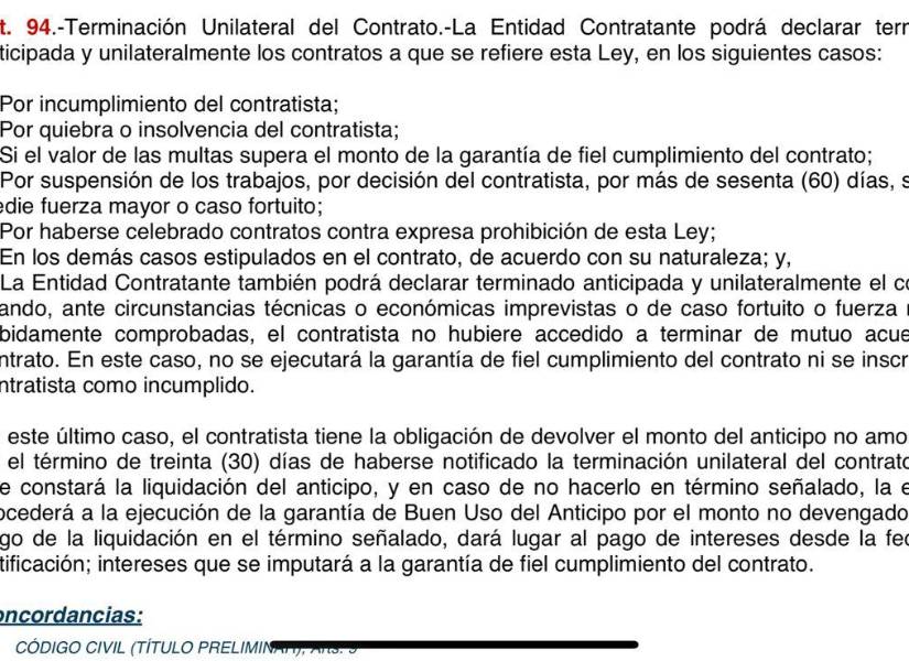 El contrato expone cinco causales generales para culminar unilateralmente los servicios con la empresa de seguridad. Además, también toma en cuenta el artículo 94 de la Ley de Contratación Pública (detallado en la siguiente imagen).