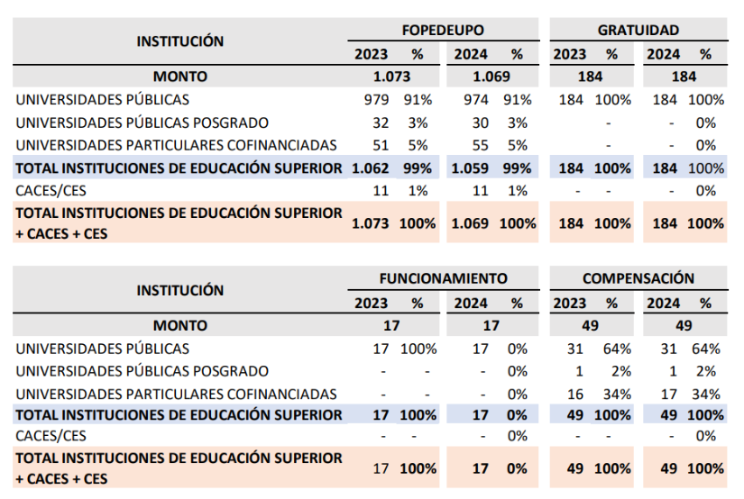 Adicionalmente, el gobierno prevé asignar USD 184 millones por concepto de gratuidad, USD 17 millones por funcionamiento, y USD 49 millones por compensación. Estos son los mismos valores que el 2023, obligatorios a realizarse por ley.