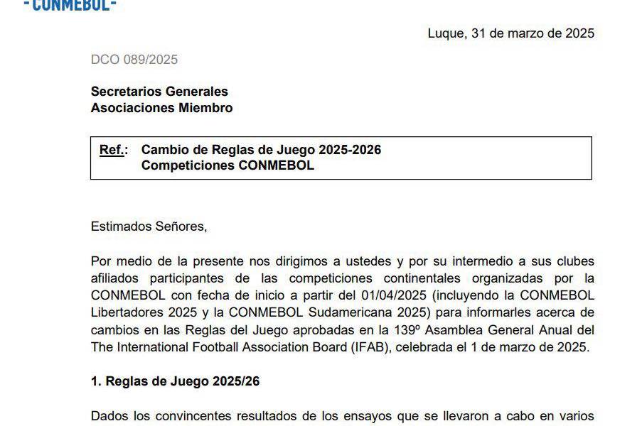Si bien la mayoría de las modificaciones aprobadas por la IFAB entrarán en vigor el 1 de julio de 2025, esta en particular se implementará de inmediato en los torneos organizados por la Conmebol.
