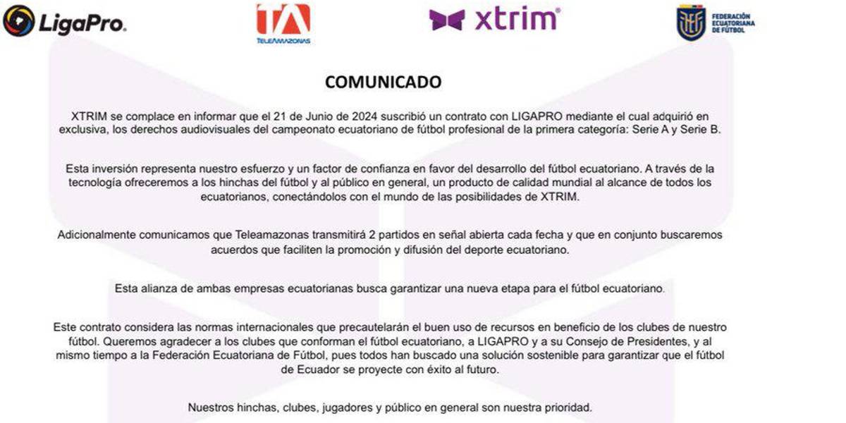Y finaliza con un mensaje "nuestros hinchas, jugadores y público en general son nuestra prioridad". A partir de la segunda etapa del torneo local se podrá ver el fútbol a través de Xtrim. Se desconoce los valores del nuevo contrato.