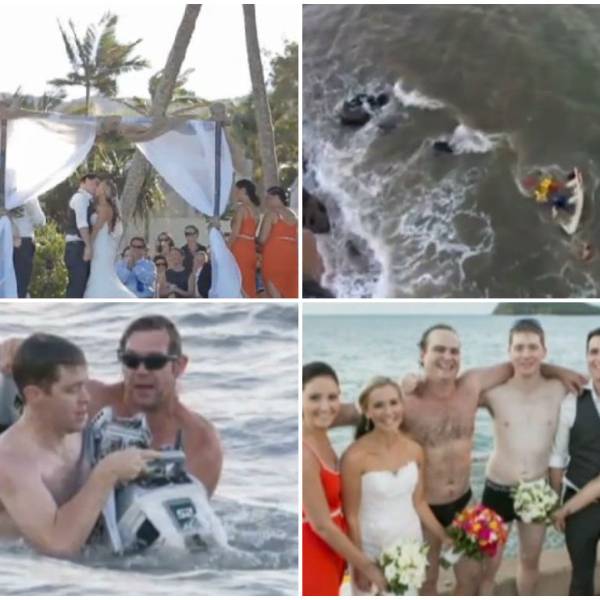 Ambos posaban en una playa de Queensland, Australia, inmortalizando en video los primeros momentos de su vida juntos. De pronto, el camarógrafo se percata de que en el agua hay un pescador en peligro. Los padrinos no lo pensaron dos veces, se quitaron la ropa y se lanzaron al agua al rescate del pescador, cuya barca se había volcado.