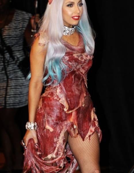 Lady Gaga usó este vestido cuando aceptó el premio al Video del Año por "Bad Romance". El debate entonces se concentró en si la cantante pop estaba haciendo con él alguna declaración de fondo o simplemente buscaba impactar.
