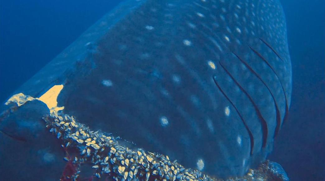 El buceador cree que el tiburón ballena arrastraba la red por al menos una semana, ya que el arte de pesca industrial estaba incrustado en la piel cerca de 10 centímetros.