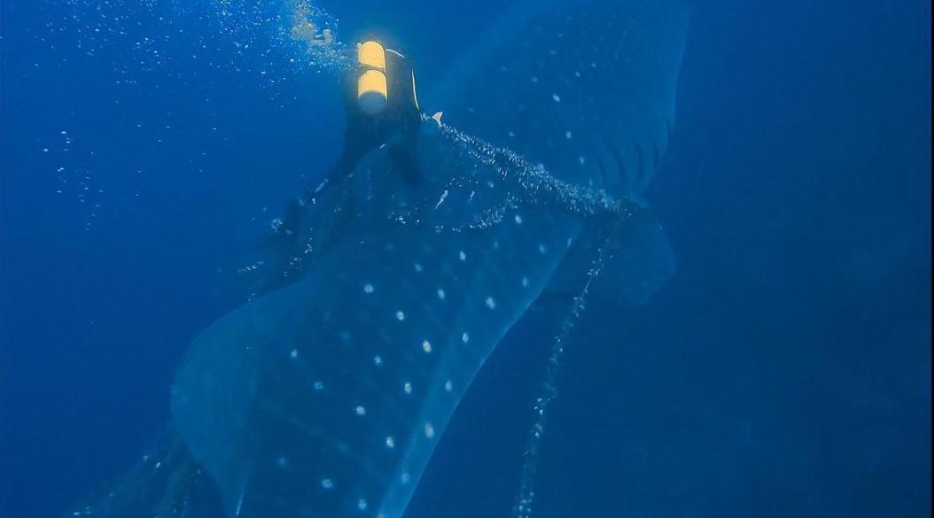 Freire divisó a 18 metros de profundidad una hembra de tiburón ballena, el pez más grande del mundo, atrapada con una red, la cual hacía que el animal descendiera aún más en profundidad.