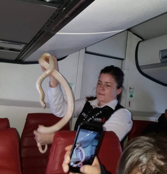 Lo cierto es que la singular mascota no era venonosa y por ello una azafata pudo guardarla gentilmente en una funda plástica, incluso hubo tiempo para que los pasajeros le tomen una foto a la serpiente.