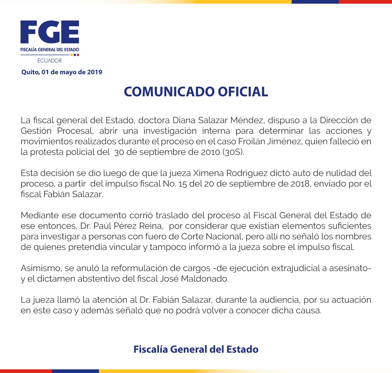 Dentro del caso del asesinato del policía Froilán Jiménez el 30 de septiembre de 2010, la juez Ximena Rodríguez declaró la tarde del miércoles 1 de mayo de 2019 la nulidad de todo lo actuado desde el 20 de septiembre de 2018.
