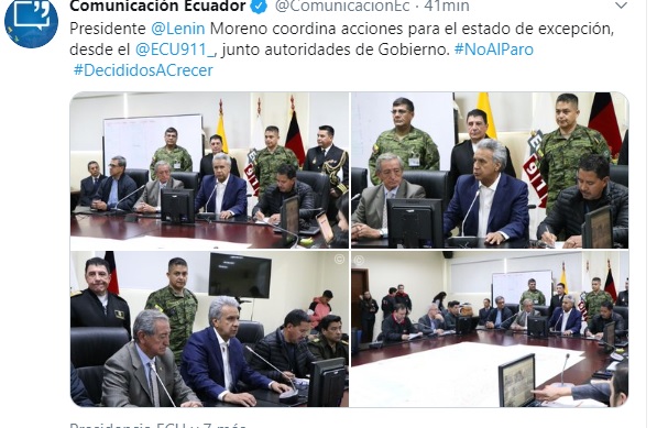 Luego de decretar estado de excepción por la situación del país durante la jornada de paralización que vivió el país, la tarde del jueves 3 de octubre de 2019 el presidente Lenín Moreno dirige los operativos de seguridad para varias zonas de la nación.