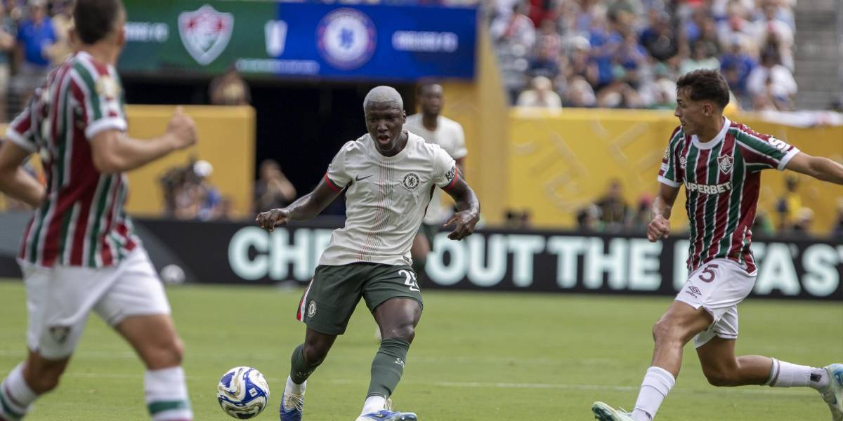 Moisés Caicedo (c) durante un partido del Mundial de Clubes entre Fluminense y Chelsea en el estadio MetLife de Nueva Jersey.( )