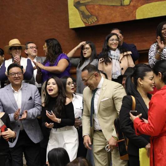 Los asambleístas del correísmo festejando la destitución de Fausto Murillo.( )