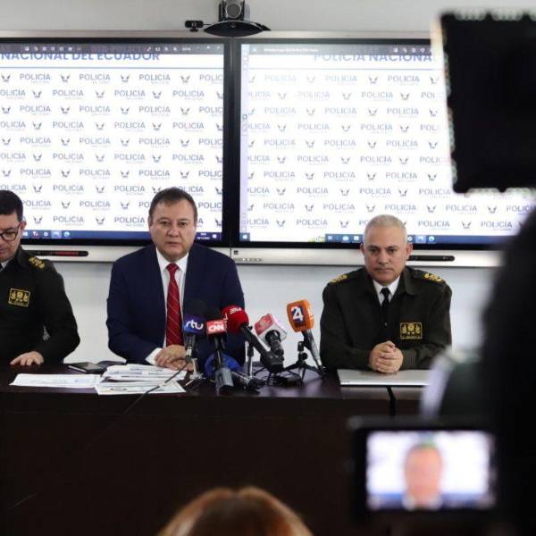 Juan Zapata (c), ministro del Interior de Ecuador, en una rueda de prensa.