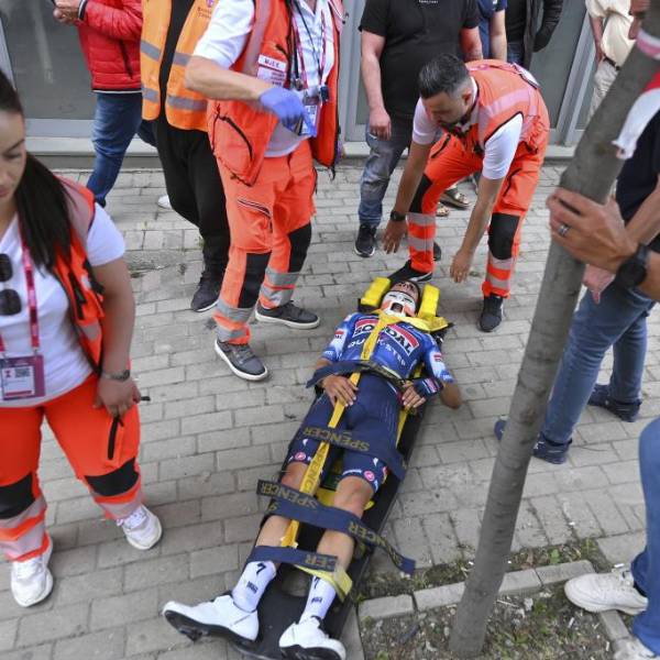 El corredor vasco (35 años) del Soudal Quick-Step, tercero del Giro en 2015 y 2022, tuvo que ser evacuado en camilla tras irse al asfalto en un descenso, a cinco kilómetros de la meta en la capital albanesa.