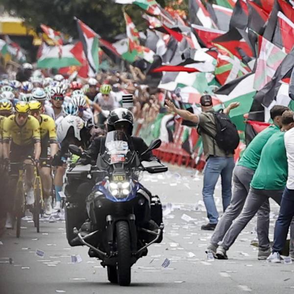 El pasado martes, al paso por la localidad navarra de Lumbier (norte), varias personas trataron de parar el pelotón, aunque finalmente no lo lograron. Y durante varias etapas se han visto innumerables banderas palestinas y pintadas en la carretera a lo largo del recorrido.