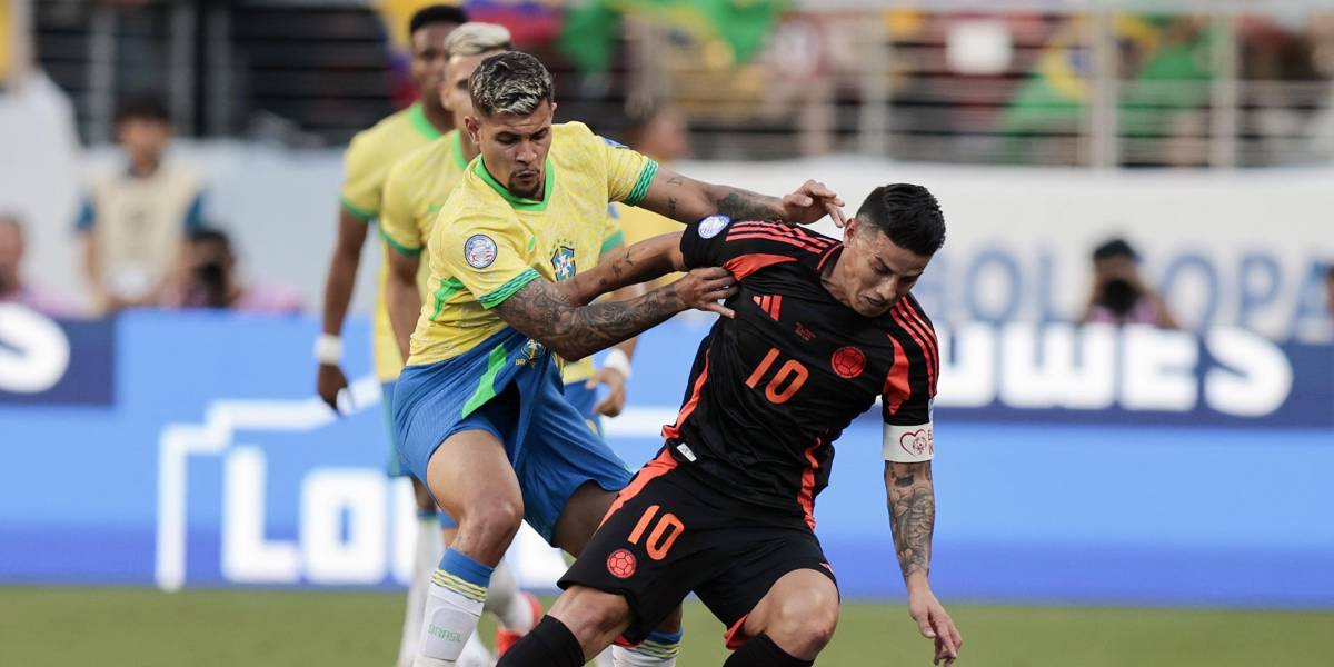 James Rodríguez ante la marca de Bruno Guimaraes por la Copa América ( )
