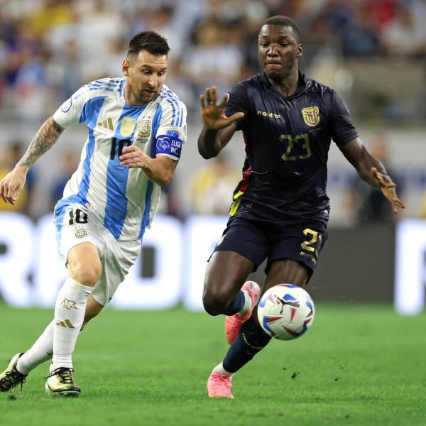 Moisés Caicedo disputando un balón con Lionel Messi. ( )