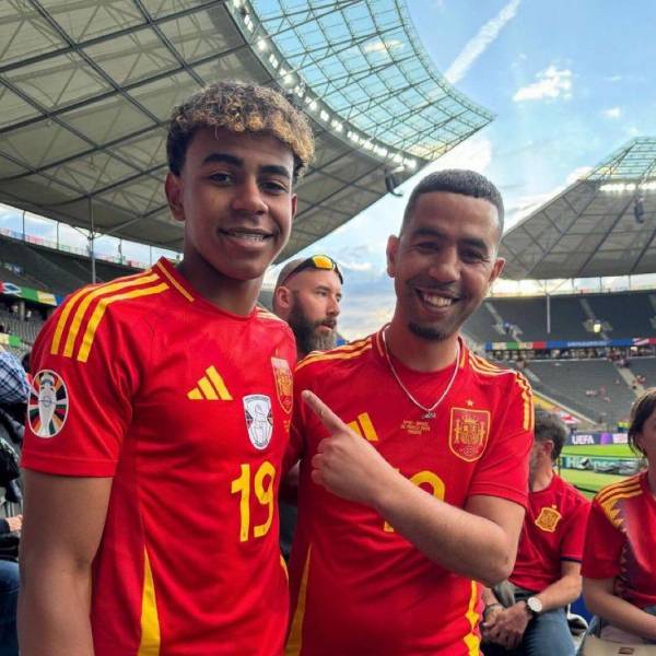 Lamine Yamal posa con su padre, Mounir Nasraoui, ambos con las camisetas de la selección de España( )
