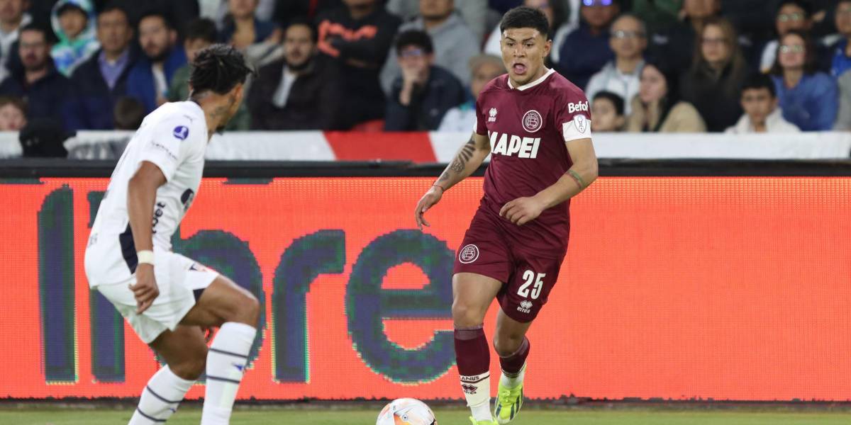 Dylan Fabricio Aquino de Lanús controla un balón este miércoles, en el partido de ida de octavos de final de la Copa Sudamericana entre LDU Quito y Lanús en el estadio Rodrigo Paz Delgado en Quito( )