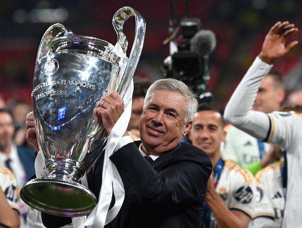 Carlo Ancelotti, entrenador del Real Madrid, levanta el título de campeón de la Champions League ( )
