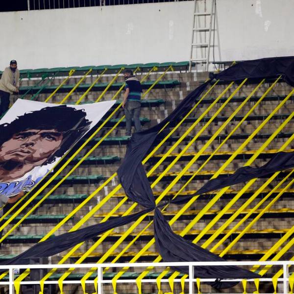 Pancarta con la imagen de Maradona. Foto: AP.