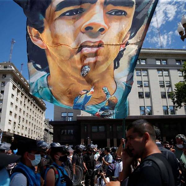 Bandera de Maradona en Plaza de Mayo. Foto: EFE.