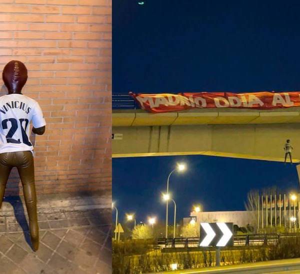 En una carretera madrileña, según un vídeo difundido este jueves en las redes sociales, aparece una pancarta con la leyenda 'Madrid odia al Real' y un muñeco con la camiseta del Real Madrid de Vinicius colgado del puente.