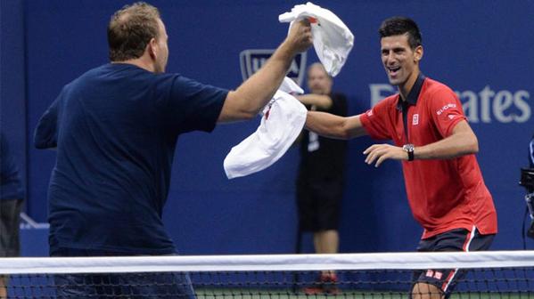 Tras ser entrevistado por un medio de comunicación, “Nole” llamó a un aficionado que estaba en las gradas para que lo acompañe en la pista del Arthur Ashe Stadium.