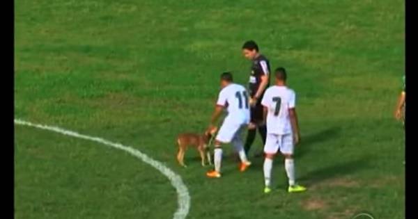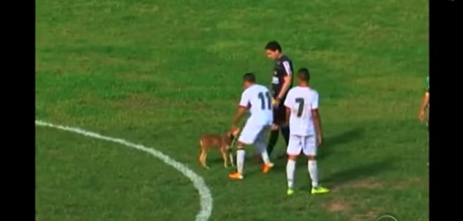 El perro entró al campo cuando faltaban 30 minutos para terminar el juego entre Sao Paulo-RS y Farroupilha, por un torneo regional el sábado. El atacante Eduardo Mandai, alias 'Dudu', del Sao Paulo (club de la ciudad de Rio Grande, sur), lo cargó para sacarlo y en el camino el animal lo mordió. Su equipo perdía por 2-1 y después del incidente, empató y remontó en 10 minutos.
