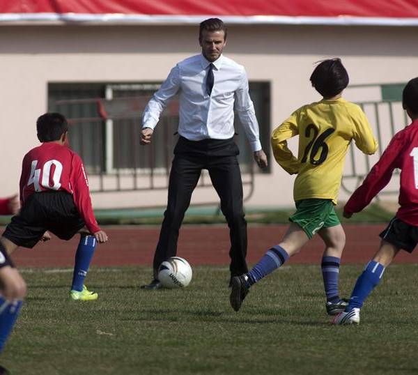 Beckham arrastra multitudes en China jugando en traje y corbata -