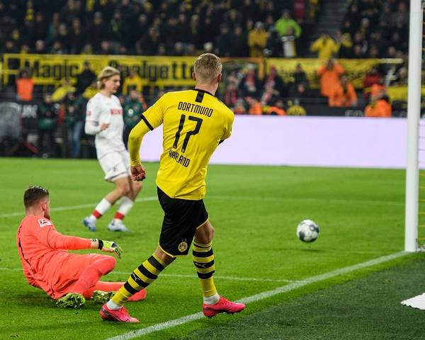 Raphael Guerreiro (minuto 1), Marco Reus (29), Jadon Sancho (48) y el joven noruego Erling Haaland (77, 87) marcaron para el Borussia Dortmund, mientras que Mark Uth firmó en el 65 el tanto del honor del Colonia.