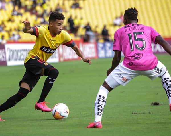 Byron Castillo, conduce el balón ante la marca de Caicedo. Foto: BSC.