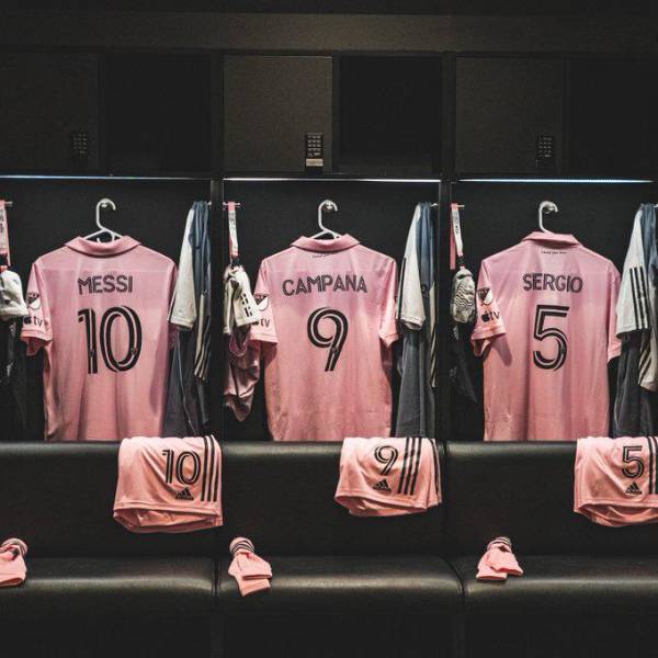 Vestuario del Inter de Miami, con las camisetas de Lionel Messi, Leonardo Campana y Sergio Busquets( )