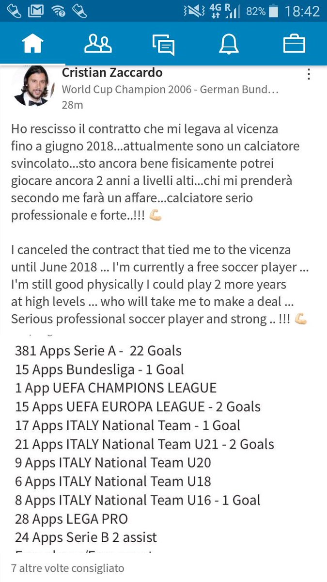 "El que me elija, en mi opinión hará un buen negocio". Así se expresó Cristian Zaccardo, campeón del mundo en 2006 con Italia, en su perfil de la red social Linkedin, donde ofrece sus servicios al club que quiera ficharlo.