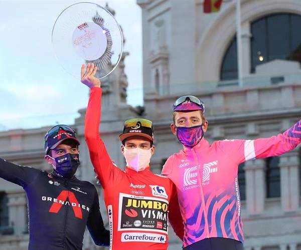 Carapaz, de 27 años, subió al podio junto al esloveno Primoz Roglic (Jumbo Visma), ganador de la Vuelta, y el británico Hugh Carthy (EF), tercer clasificado.