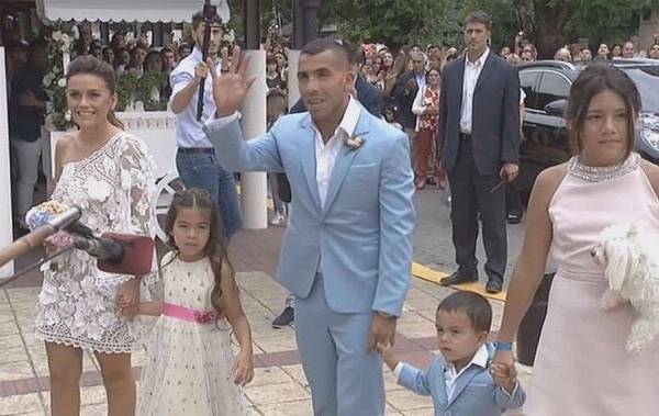 Tevez llegó vestido con un traje color celeste y camisa blanca junto a Vanesa, su pareja de 19 años con la que tuvo sus tres hijos: Florencia (9), Katie (6) y Lito (2).