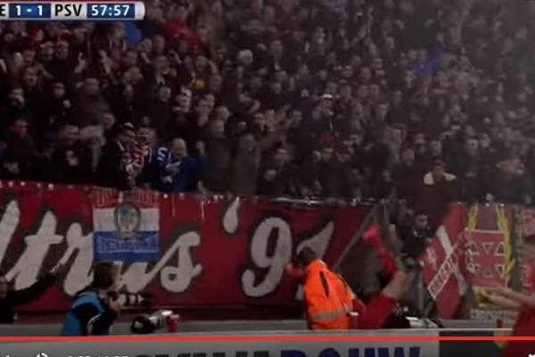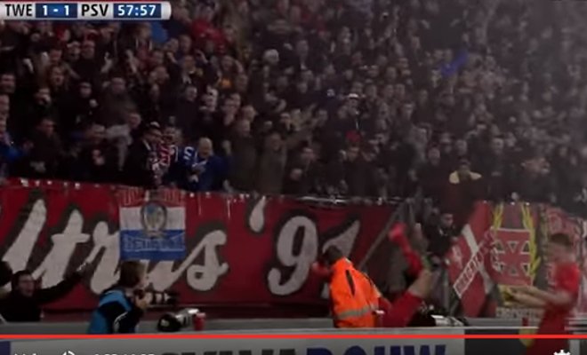 Tras anotar un gol ante el PSV Eindhoven, el delantero del Twente de Holanda, Hakim Ziyech, se fue a festejar con los aficionados, pero el resultado no fue el que esperaba.