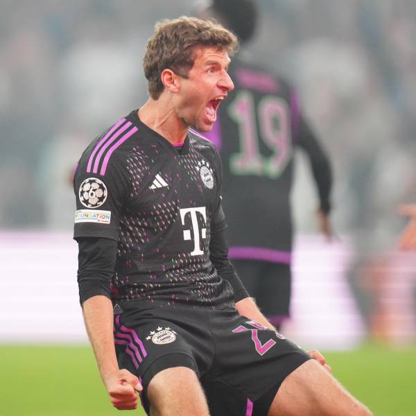 Thomas Muller, jugador alemán, celebrando el gol de Mathys Tel para darle la victoria 2-1 al Bayern Munich ante el Copenhague por la Champions League.( )