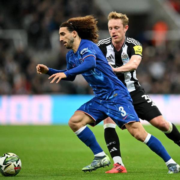 El lateral izquierdo del Chelsea, Marc Cucurella, disputa el balón con Sean Longstaff, jugador del Newcastle por los octavos de final de la Carabao Cup( )