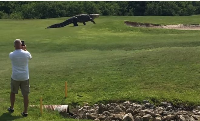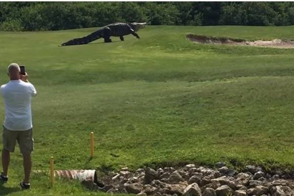 Un cocodrilo de casi cinco metros de largo se paseó por un campo de golf en Buffalo Creek en Florida dejando atónitos a los jugadores que vieron al reptil caminar tranquilo por el green.