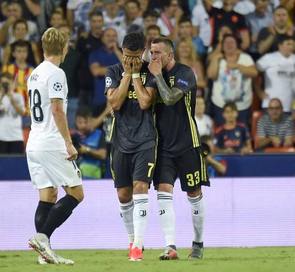 Ronaldo tuvo un encontronazo en el área del Valencia con el colombiano Jeison Murillo, al que dio un leve golpe en el pie y otro en la cabeza cuando discurría el minuto 30 de la primera parte. El cinco veces ganador del Balón de Oro reaccionó a su expulsión con airadas protestas y abandonó llorando el terreno de juego.