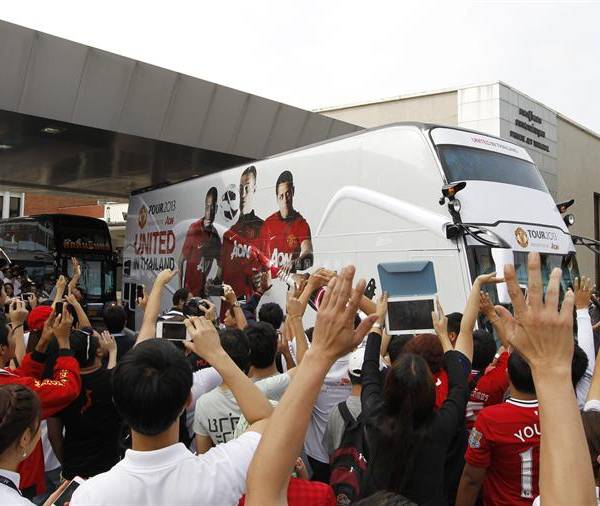 Decenas de seguidores recibieron hoy en Bangkok al campeón de la liga de fútbol inglesa, Manchester United, que jugará el sábado su primer partido de pretemporada en su gira por Asia y Australia.
