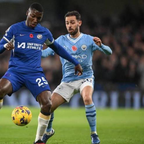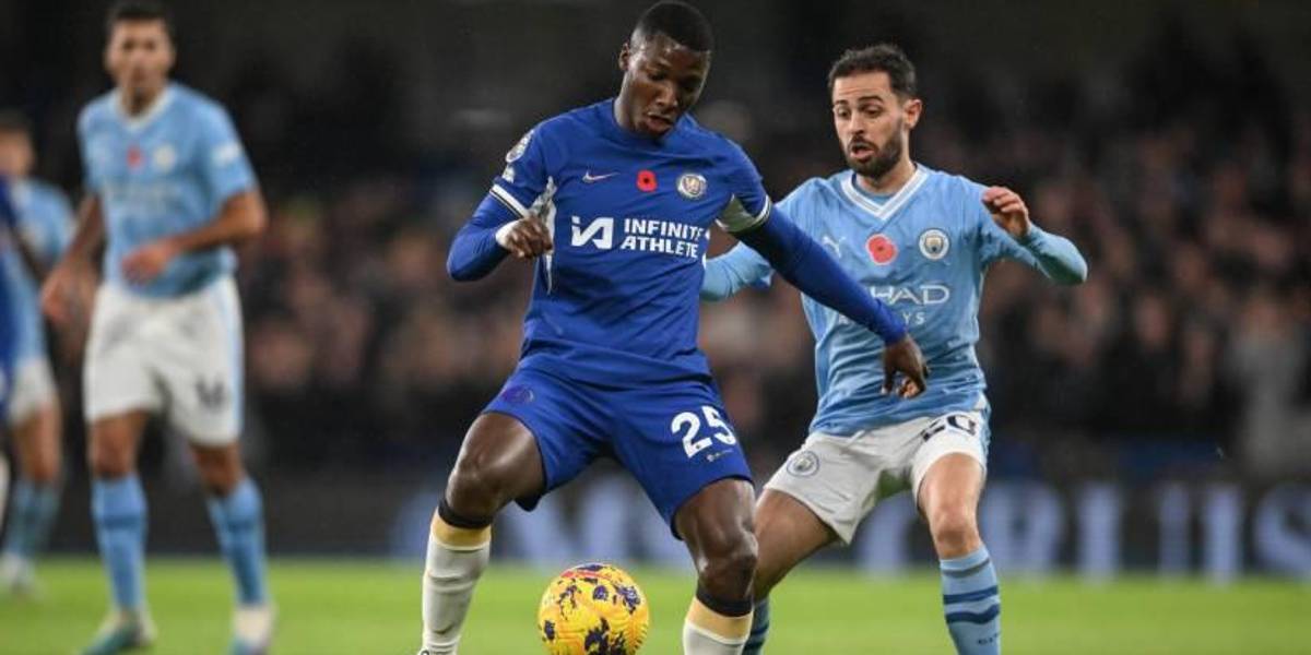 Moisés Caicedo rivalizando contra Bernardo Silva del Manchester City.( )