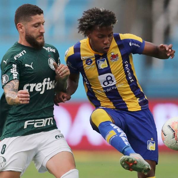 Jugador de Delfín ante la marca de un elemento de Palmeiras. Foto: Libertadores.