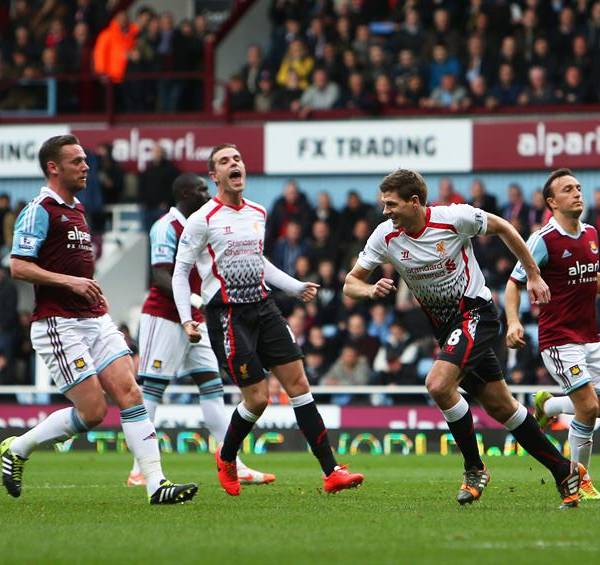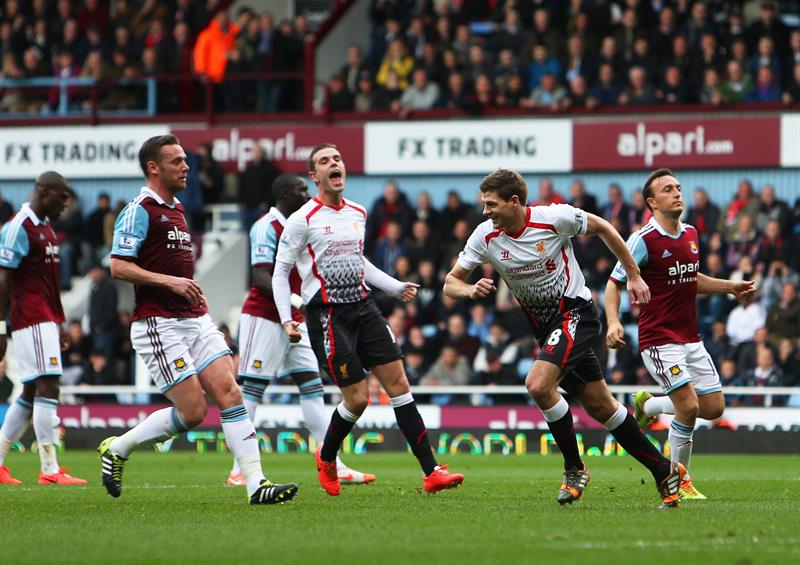 Dos penaltis transformados por Steven Gerrard dieron el triunfo en el campo del West Ham (1-2) al Liverpool, que mantiene el liderato de la Liga de Inglaterra del que se distancia el Arsenal, derrotado con claridad por el Everton (3-0).
