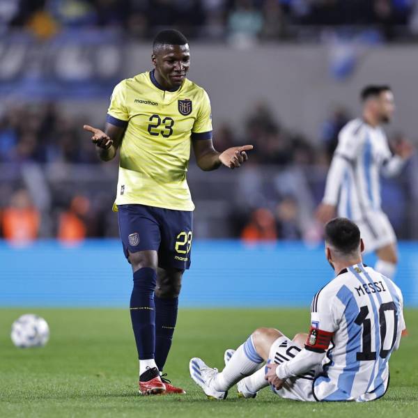 Moisés Caicedo, marcando a Lionel Messi.( )
