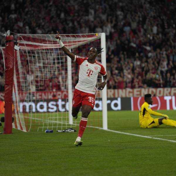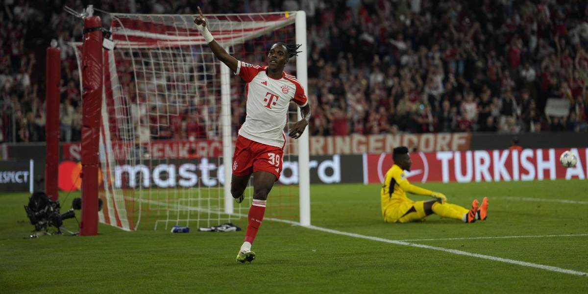 Mathys Tyl, jugador del Bayern Munich, celebrando el cuarto gol ante el Manchester United por la Champions League.( )