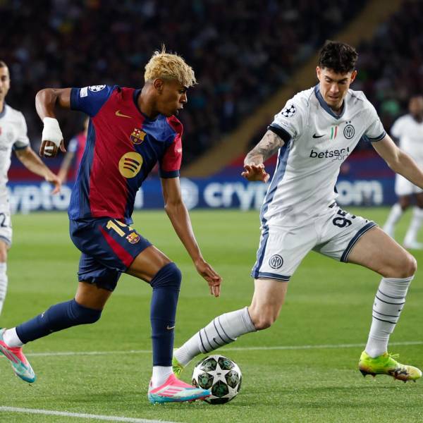 Lamine Yamal disputa el balón con Alessandro Bastoni en la semifinal de ida de la Champions League( )