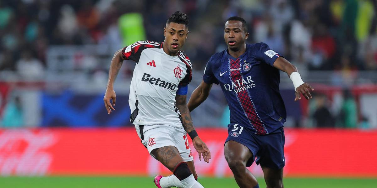 El delantero brasileño del Flamengo, #27 Bruno Henrique (izq.), y el defensor ecuatoriano del París Saint-Germain, #51 Willian Pacho, disputan el balón durante la final de la Copa Intercontinental de la FIFA 2025( )
