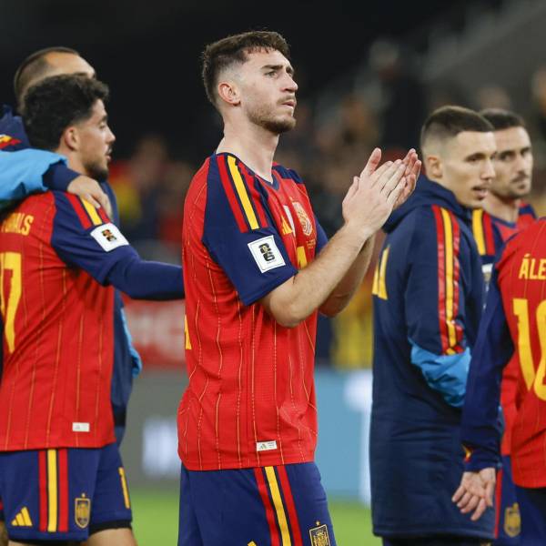 El defensa de la selección española de fútbol, Aymeric Laporte, aplaude a la afición tras el encuentro correspondiente a la fase de clasificación para el Mundial 2026( )