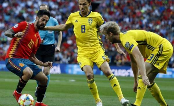 El español Isco ante la marca de dos suecos.