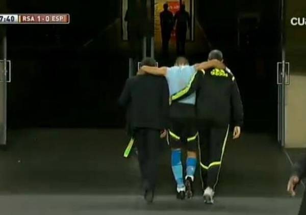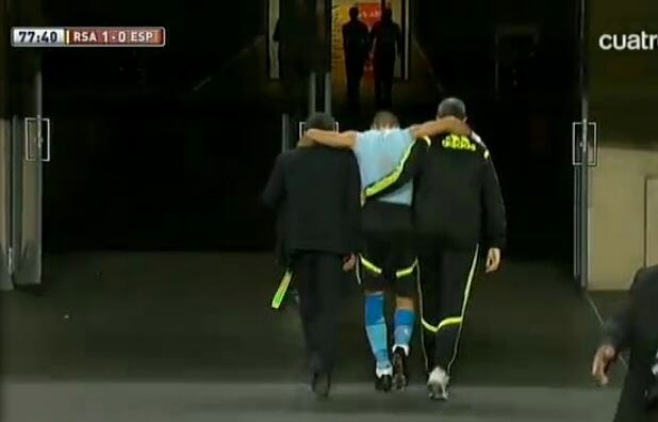 El portero barcelonista Víctor Valdés sufrió una lesión muscular en el transcurso de la segunda parte del amistoso en el Soccer City ante Sudáfrica, y provocó una discusión en los banquillos por la entrada de Pepe Reina con los seis cambios realizados por Vicente del Bosque.